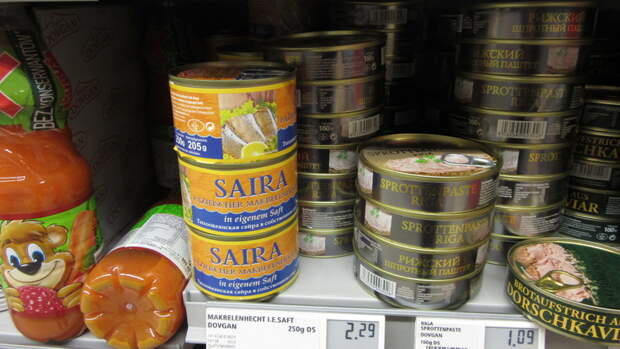 В немецких крупных магазинах и сегодня существуют так называемые "русские полки", где можно купить сайру, шпроты, печень трески, сгущеное молоко и другие продукты (на фото), но многие из них везут не из России, а из стран Прибалтики, Молдовы, Украины и Белоруссии. Подобные "русские магазины" существуют и в других странах Европы, например, в Болгарии. Они рассчитаны как на эмигрантов из России,так и на местных жителей, знакомых с советскими продуктами по прошлым эпохам.